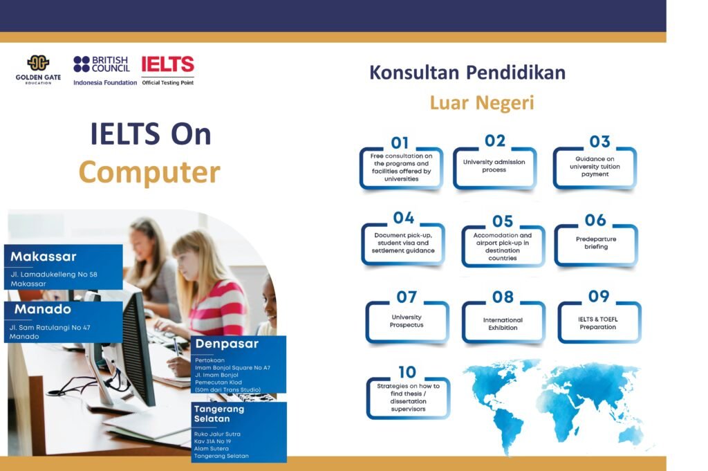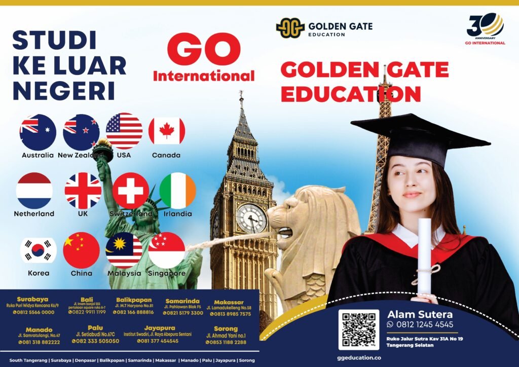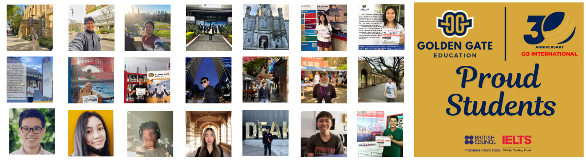 Golden Gate Education adalah konsultan pendidikan luar negeri yang sangat berpengalaman berdiri sejak 1996, merupakan pusat pengurusan dan pendaftaran studi ke luar negeri sebagai One Stop Education mulai dari konsultasi studi, pendaftaran ke universitas luar negeri, persiapan bahasa inggris, pengurusan student visa, Pendamping dan Pencarian Akomodasi, serta IELTS Test Point